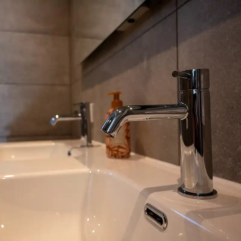 • Geräumiges Badezimmer mit begehbarer Dusche, Waschtischunterschrank mit Doppelwaschbecken und Toilette