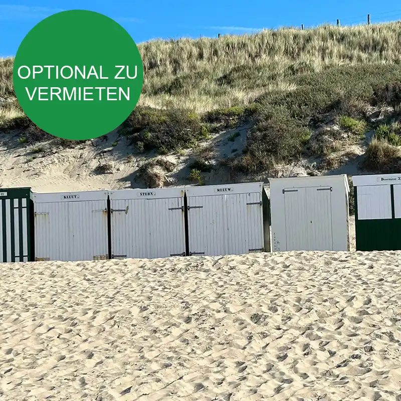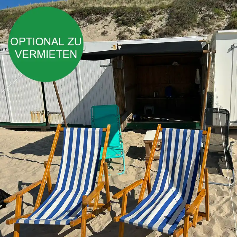 • Möglichkeit, ein Strandhaus zu mieten (falls verfügbar) mit 2 Sonnenliegen, 2 Liegestühlen, Sonnenschirm, Tisch, Kleiderhaken und Bank – €95 pro Woche